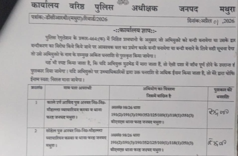मथुरा 2 अप्रैल 26 प्रशासन द्वारा अभियुक्तों के ऊपर– इनाम घोषित*