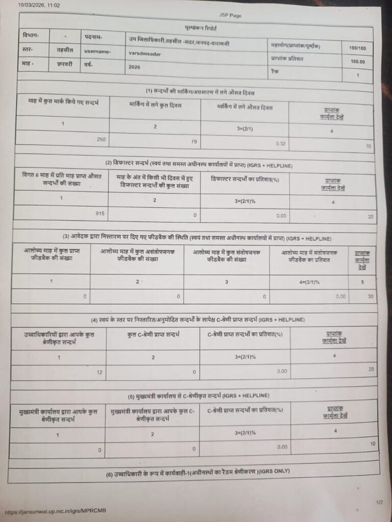 वाराणसी 10 मार्च 26*आईजीआरएस निस्तारण में इस बार वाराणसी जनपद का “तहसील सदर” प्रदेश में नंबर-1*